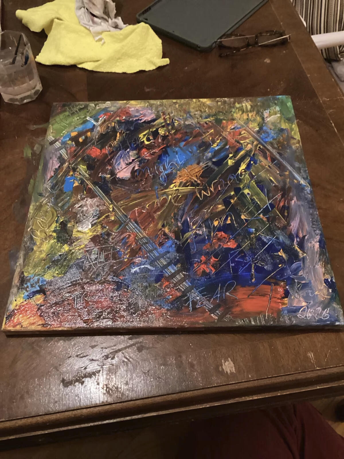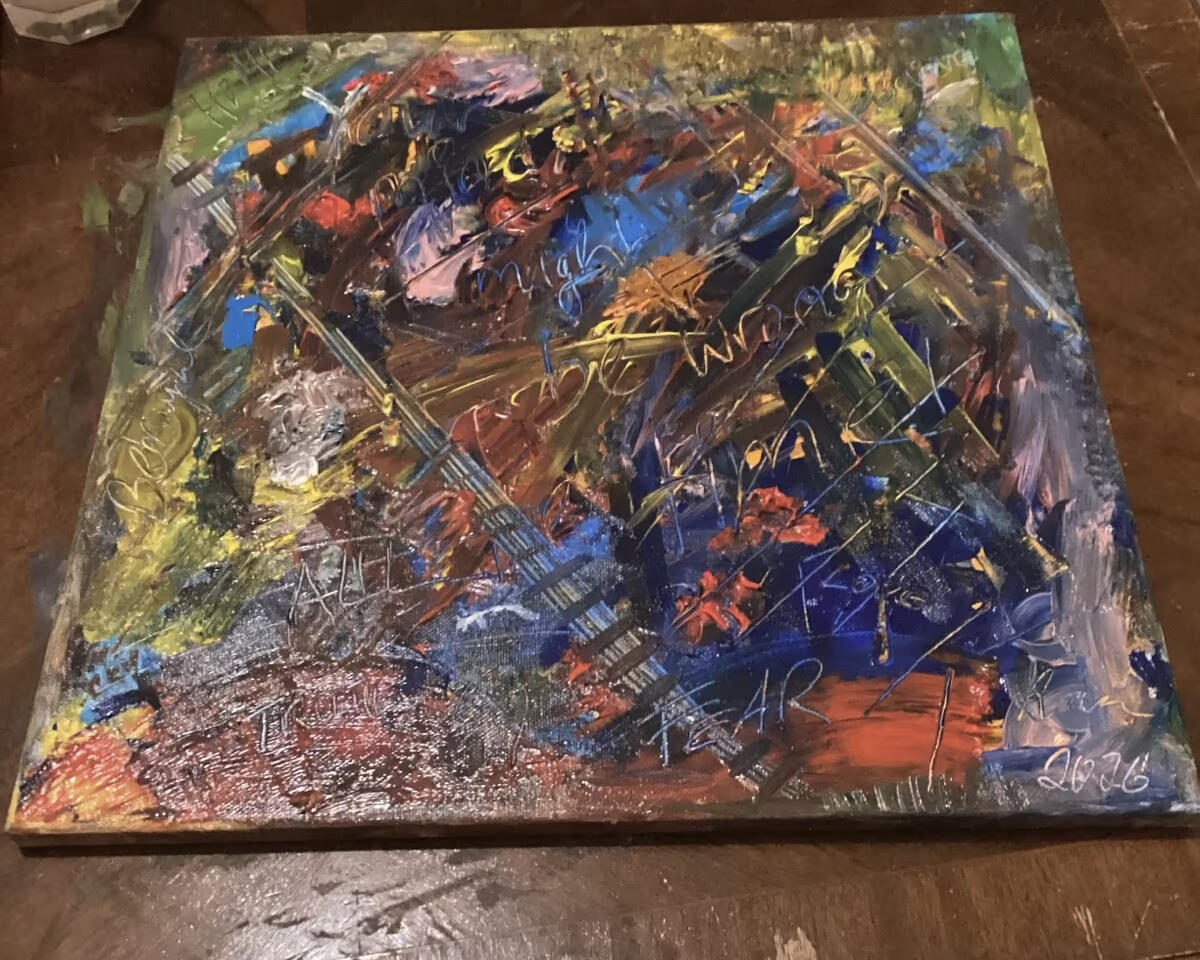 WERKBESCHREIBUNGOriginales Ölgemälde auf Leinwand.Dieses Bild entstand intuitiv in mehreren Farbschichten aus Bewegung, Emotion und spontanen Entscheidungen heraus. Linien, Übermalungen und Kratzspuren bleiben bewusst sichtbar und erzählen vom Prozess selbst.Die Arbeit bewegt sich zwischen Chaos und Struktur. Dunkle und leuchtende Bereiche stehen im Kontrast zueinander und erzeugen eine starke Dynamik aus Blau-, Rot-, Gold- und Grüntönen.Der Titel Right After Rock Bottom beschreibt den Moment direkt nach dem Tiefpunkt – den Augenblick, in dem etwas zerbricht und gleichzeitig etwas Neues beginnt.